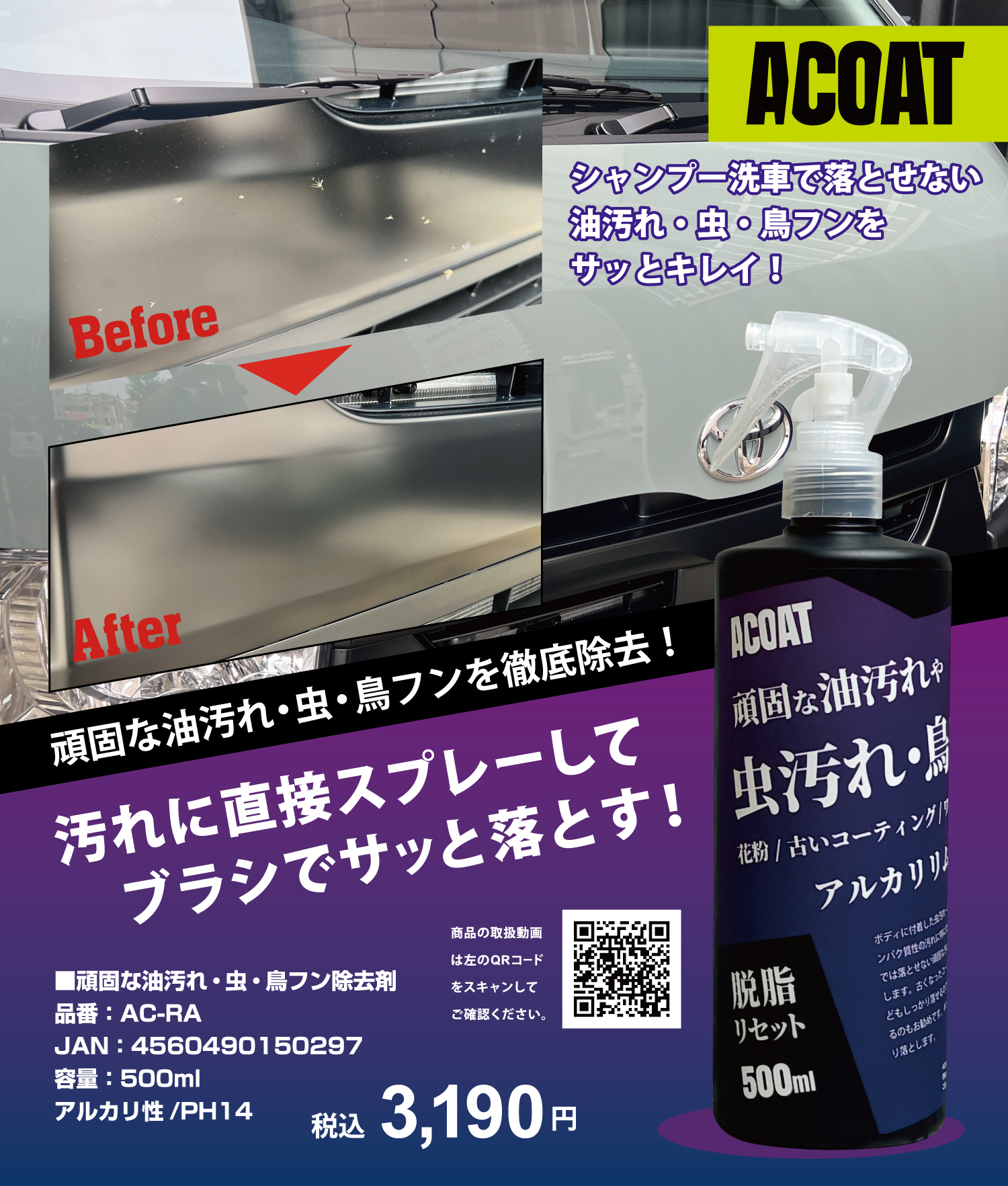 軽度な油汚れ・虫汚れ・鳥フンなど、中性のカーシャンプーだと汚れが伸び落とせない汚れをキレイに落とします。