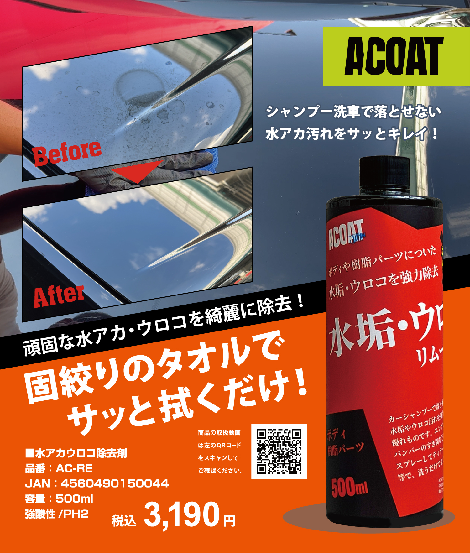 軽度な水アカ・水シミ・イオンデポジットなど、中性のカーシャンプーでは落とせない汚れをキレイに落とします。